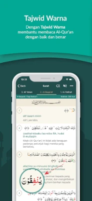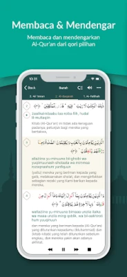 Ji daɗin cikakken karatun mp3 murattal na juz'i 30 daga zaɓin Qori guda takwas. Kana da cikakken ikon sarrafa karatun (kunna, dakatarwa, tsayawa, gaba, baya, maimaitawa), da kuma sarrafa fayilolin audio domin sauke ko goge su lokaci guda. Wani babban fasali shi ne ikon adana alamar karatu na ƙarshe da kuma abubuwan da ka adana (bookmarks) zuwa girgije (Cloud) don aminci da dawo da su. Akwai kuma fassarar kalma-kalma daga Larabci zuwa Indoneziya, da kuma Tajwidi mai launi don taimakawa wajen inganta karatunka. Ba wai kawai Alkur'ani ba, har ma tana dauke da jadawalin lokutan sallah da imsakiyya, ciki har da ƙararrawa ta Azan, da kuma kalandar jadawalin sallah na kwana 30 masu zuwa. Haka kuma, tana da mai nuna alkibla da kalandar Hijira. Zaka iya bincika ayoyi cikin sauki ta amfani da kalmomin bincike a cikin fassara.