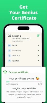 "Learn How to Think App" ya zo da fasaloli masu amfani don sauƙaƙe tafiyar koyon ku. Ku ji daɗin darussa masu jan hankali ta sauti waɗanda ke bayyana dabaru masu wuya cikin sauƙi. Akwai takaitattun darussa masu iya gyarawa don keɓance koyon ku, da tambayoyin darussa don gwada iliminku. Haka kuma, za ku samu kalamai masu dacewa don kowane darasi don ƙarfafa tunanin ku. Idan kun kammala horon, za ku samu takardar shedar kammalawa, wanda ke nuna jajircewarku ga zama mai zurfin tunani. Ku buɗe kirkire-kirkirenku, ku samar da sabbin dabaru, ku warware matsaloli fiye da kowane lokaci. Kada ku yi koyi da abin da za ku yi tunani kawai; ku koyi yadda za ku yi tunani da kanku tare da "Learn How to Think App"!