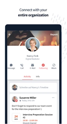 Da wannan manhaja, kowane mai amfani yana da damar ƙirƙirar bayanan martaba na musamman da suka haɗa da jerin lambobin waya, wanda ke sa ganowa da haɗi da abokan aiki ko 'yan uwa cikin sauƙi. Yana da keɓaɓɓen shafi mai nuna labarai (timeline feed) wanda aka tsara don kawo muku abubuwan da suka fi dacewa da ku, don haka za ku ga bayanai masu amfani ba tare da an cika ku da hayaniya ba. Bugu da ƙari, akwai shafuka da al'ummomi daban-daban da za ku iya bi ko shiga, suna ba ku damar kasancewa cikin sanin sabbin labarai da ci gaba a fannoni ko ƙungiyoyi da kuke sha'awa.